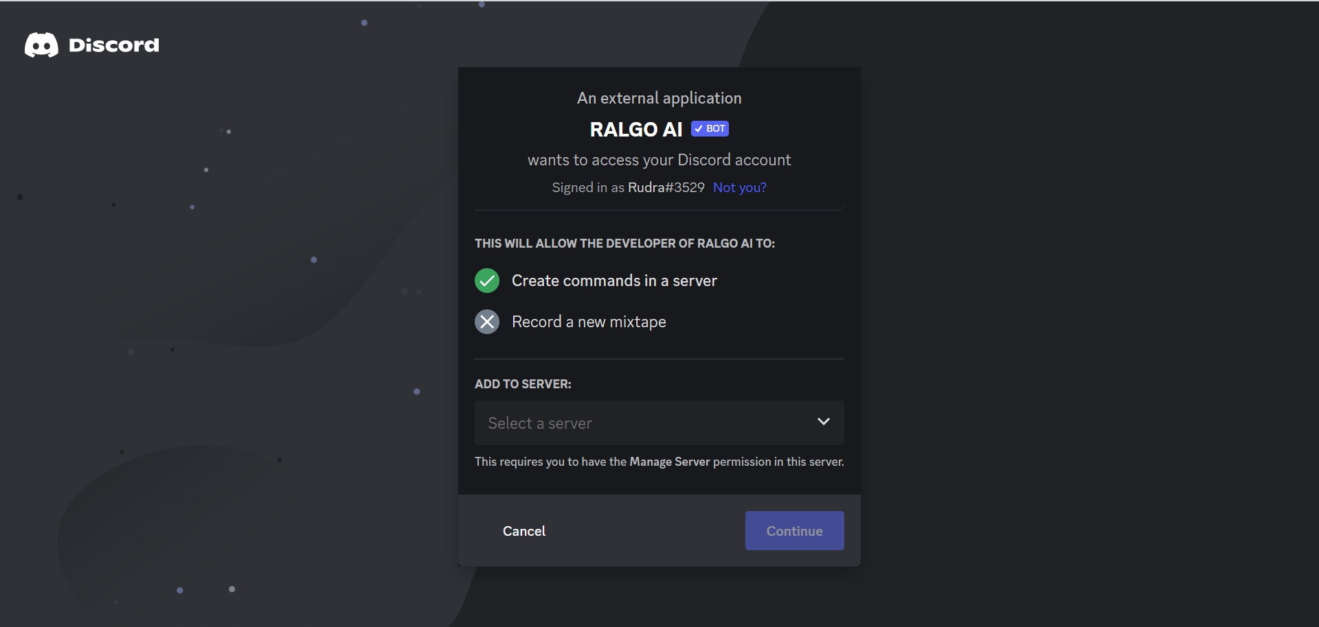 2. Select the server you want to add the bot to from the drop-down menu. If you are not the owner of the server, you will need to have the "Manage Server" permission to do this.